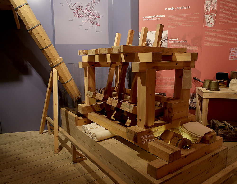 Η έκθεση παρουσιάζει λειτουργικά ομοιώματα των υδροκίνητων μηχανών που επινοήθηκαν για την άλεση των καρπών-οι νερόμυλοι, την πρίση των ξύλων- τα νεροπρίονα , και την πίληση (πύκνωση) των μάλλλινων υφαντών –οι νεροτριβές κα τα μαντάνια, απαλλάσσοντας τον άνθρωπο από τον μόχθο των αντίστοιχων χειρωνακτικών εργασιών. Η έκθεση αυτή, προπομπός του τριθεματικού κύκλου των μονίμων εκθέσεων του Μουσείου, αποσκοπεί στην ανάδειξη της τεχνολογίας ως παραμέτρου παραγωγής του πολιτισμού. Με εξαίρεση των νερόμυλο, που ανάγεται στον 1ο προχριστιανικό αιώνα , οι άλλες δύο μηχανές πρωτοεμφανίζονται στον δυτικό Μεσαίωνα (το μαντάνι) και την Αναγέννηση (το νεροπρίονο), ενώ στον ελληνικό χώρο καταγράφονται από τον 19ο αιώνα. Καθώς με τη διάχυσή τους διαδίδεται η ιδέα της μηχανής, γίνεται φανερό ότι η σημασία τους υπερβαίνει τη χρηστική τους αξία και αποκτά τη διάσταση οριακού ανθρωπολογικού γεγονότος. Τα διάσπαρτα έως τη δεκαετία του 1960 υδροκίνητα εργαστήρια στην ύπαιθρο και στα aστικά κέντρα αποτελούν μνημεία της τεχνολογίας και τεκμήρια ευφυΐας του ανθρώπου, που εξαγγέλλουν την εποχή της μηχανής –την τρίτη καμπή στην ιστορία του είδους μας, μετά την οικειοποίηση της φωτιάς και την επινόηση της γεωργίας . Αποκαθιστώντας το χαμένο κύρος αυτών των διάσπαρτων στην ύπαιθρο εργαστηρίων και μέσα από τις «ανασυνθέσεις» της ζωής του μυλωνά, του πριονά και του ντριστιλιέρη-μπαταντζή, γίνεται κατανοητό γιατί τα εργαστήρια αυτά αποτελούν μνημεία του πολιτισμού και της τεχνολογίας, άξια να ερευνηθούν και να διασωθούν. Η παραδοσιακή τεχνολογία παίρνει τη θέση που της αρμόζει σε ένα σύγχρονο Λαογραφικό Μουσείο.